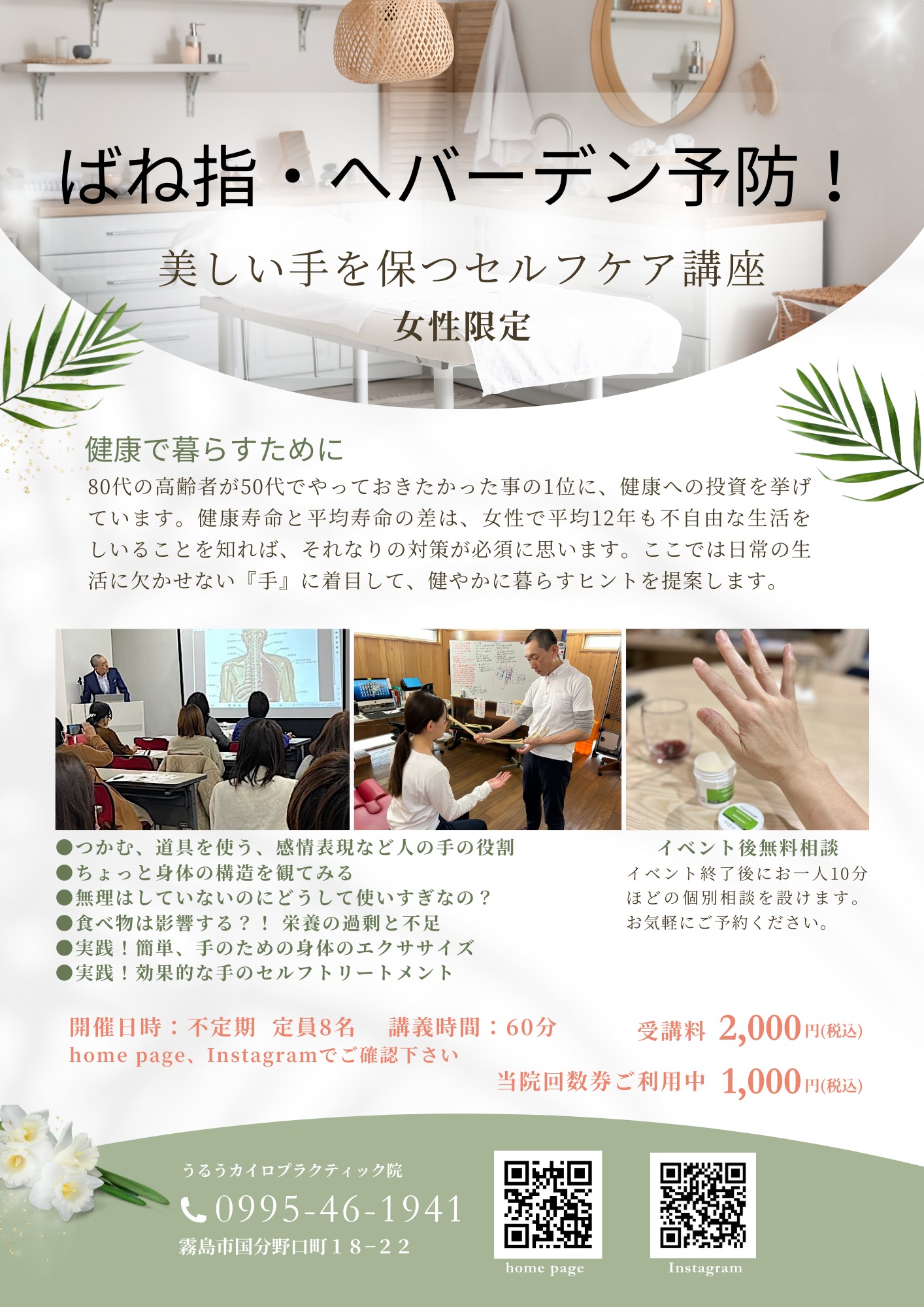 ばね指・腱鞘炎・へバーデン予防 美しい手を保つセルフケア講座のお知らせ|霧島市で疲れをとるならうるうカイロプラクティック院