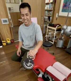 神輿をかついだ影響なのか、左上部僧帽筋が過緊張して頚椎の土台となる上部胸椎が傾いている。
