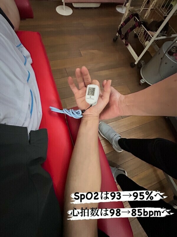 パルスオキシメータで動脈血酸素飽和度(SpO2)を測ってみると、93%と低い!